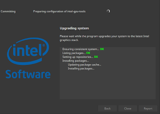 Начать апдейт собственно драйвера через только что установленную Intel® Graphics Update Tool for Linux* OS. Она кстати вызывается просто из меню. Для любителей строки intel-graphics-update-tool.