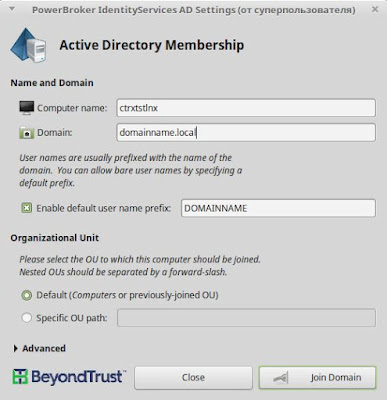 Нажать Join Domain и ввести учетные данные пользователя имеющего права на ввод в домен Windows в открывшемся окошке.