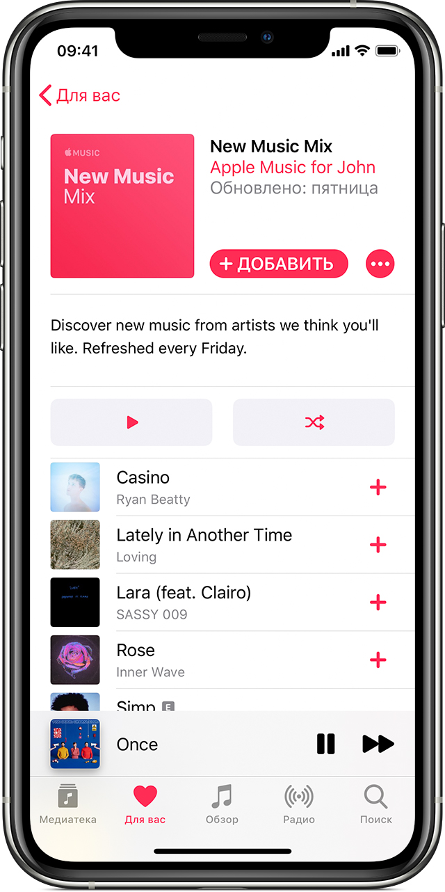 Любой общедоступный плейлист, в том числе плейлисты, находящиеся в разделе «Для вас» приложения Apple Music, или плейлисты, полученные от друзей, можно добавить в медиатеку. Чтобы сохранить плейлисты в медиатеке, выберите плейлист, который требуется сохранить, затем нажмите «Добавить».