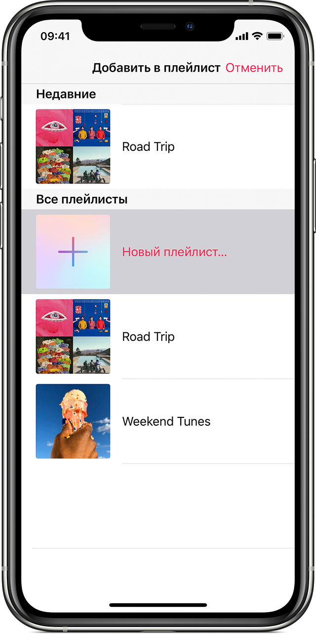 Можно также коснуться и удерживать альбом, плейлист, песню или видеоклип, затем коснуться «Добавить в плейлист» и выбрать плейлист.