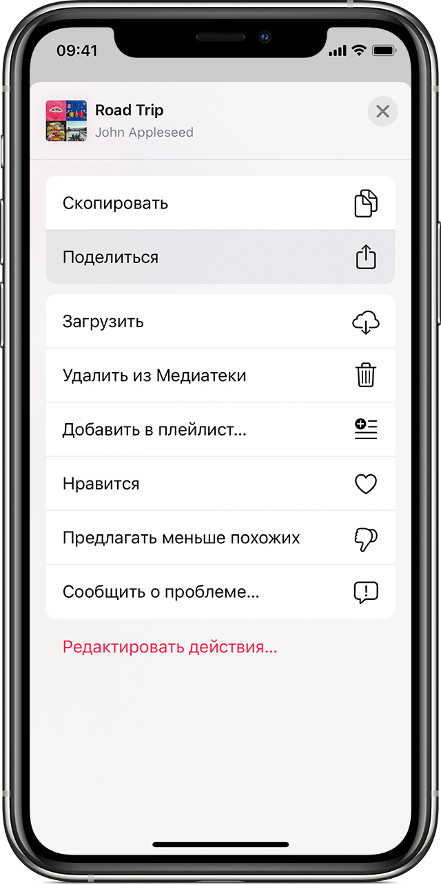 При наличии подписки на Apple Music можно отправлять плейлисты друзьям через приложения «Сообщения», «Почта», Twitter, Facebook и другие или при помощи AirDrop. Друг, которому отправляется плейлист, тоже должен иметь подписку на Apple Music.