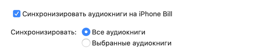 Установите флажок «Синхронизировать аудиокниги на [имя устройства]», чтобы включить синхронизацию аудиокниг.