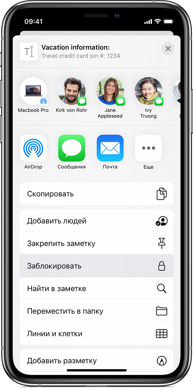 В приложении «Заметки» можно блокировать заметки с помощью пароля либо функции Face ID или Touch ID на поддерживаемых устройствах. *