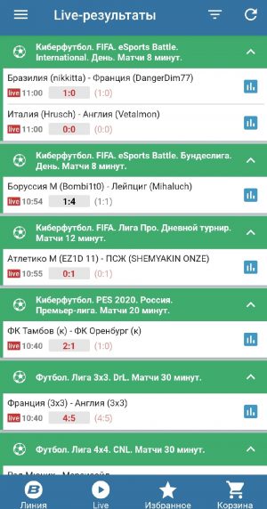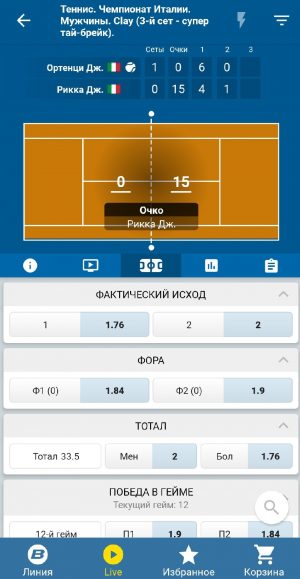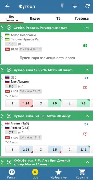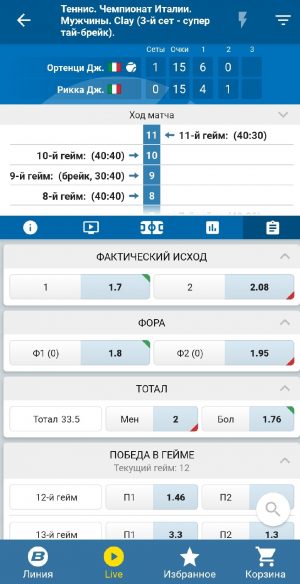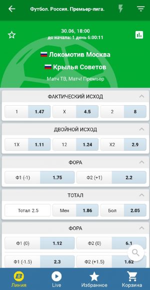 - Возможность заключать любые виды пари на все представленные в линии спортивные события, в том числе в режиме live и суперэкспресс.