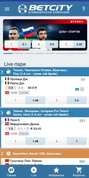 Приложение «Бетсити» оставляет приятное впечатление по интерфейсу. Никакого дублирования информации, все находится на своих местах. В верхней панели навигации вы можете наблюдать актуальные акции и бонусы. На видном месте расположены разделы с линией и лайвом.