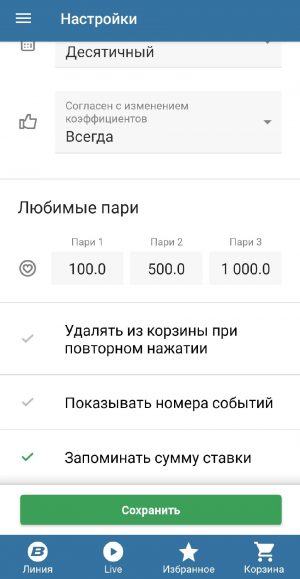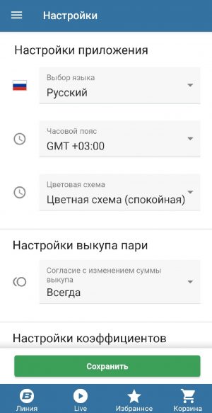 Приложение выделяется богатыми настройками, где можно указать цветовую схему приложения, вид коэффициентов (десятичные, английские, американские) и запоминать сумму ставки, чтобы не тратить время на ее ввод.