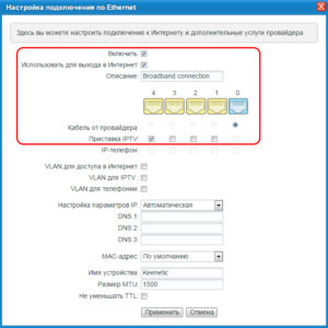 Основные провайдеры поставляют трафик телевидения в «нетегирируемом» виде. Это облегчает настройку подключения. Она сводится к выделению порта LAN (1-4), к которому с помощью кабеля с коннекторами RJ-45 на обоих концах будет подключена ТВ-приставка. При этом встроенная в Keenetic Giga программа переведет его в режим прямого получения IPTV-трафика от порта WAN используемого провайдера (прозрачный «мост»).