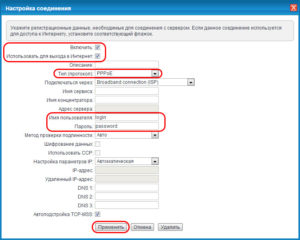 После нажатия на вкладку «Авторизация» ставим отметку в пункте «Задействовать»». Протоколом используемого соединения будет L2TP. В строке адреса сервера прописываем tp.internet.beeline.ru. Следующие поля заполняем данными (логин/пароль) из договора с провайдером, выполняем команду «Применить».