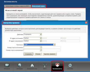 Определенным хостам назначается беспрепятственный доступ, для других назначается запрет. Страница создания правил открывается после выбора раздела «Безопасность» на главной странице интерфейса, а в нем — вкладки «Межсетевой экран». Открывается список интерфейсов с IP-адресами и указанием действий при их обнаружении. Список может быть расширен или сокращен. А также изменяются действия, применяемые к каждому участнику. В заключение выполняем команду «Сохранить».