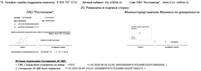 2. Никаких бумаг ты не подписываешь. Договор есть в личном кабинете. Тебе присылают логин и пароль, затем присылают код подтверждения, ты говоришь его монтажнику, он вводит его в программу — всё, договор подписан цифровой подписью! Раньше выдумывали супермелкий шрифт, сноски со звёздочкой, а сейчас действуют ещё хитрее под соусом современных технологий. Ведь не скажешь монтажнику — подожди за дверью, парень, я сейчас сяду за компьютер, открою ваш сайт, введу логин и пароль, разберусь во всех вкладках личного кабинета, найду договор, сохраню его, открою и досконально изучу.