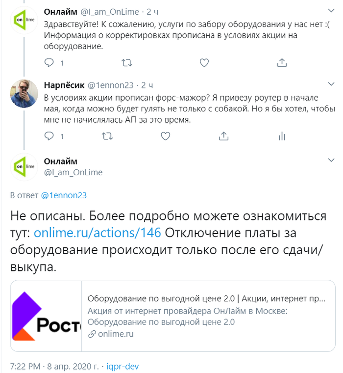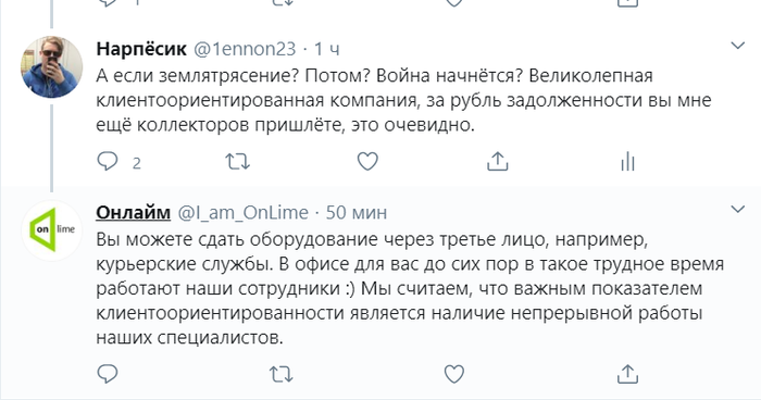 У @OnLimeSupport в Москве всего два пункта, где забирают роутеры. Курьеров у них нет. Ты должен сдать оборудование лично, либо сам передать его через курьера (и оплатить из собственного кармана). Я просил лишь об одном. Заблокировать мне все услуги и начисления по ним, а после карантина я приеду, сдам оборудование и мы вместе посмеёмся над всей этой ситуацией.