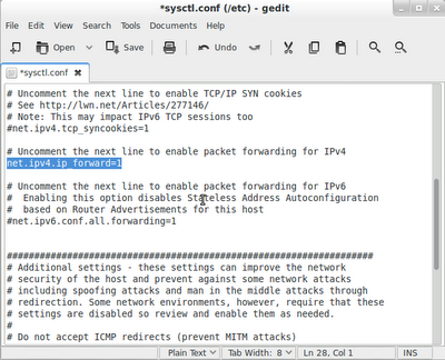 If we want to make this configuration permanent the best way to do it is using the file /etc/sysctl.conf where we can add a line containing net.ipv4.ip_forward = 1