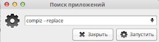 запуск Compiz. Откройте окно Поиск приложений — Alt+F2, введите и выполните команду (нажать Enter или кнопка Запустить):