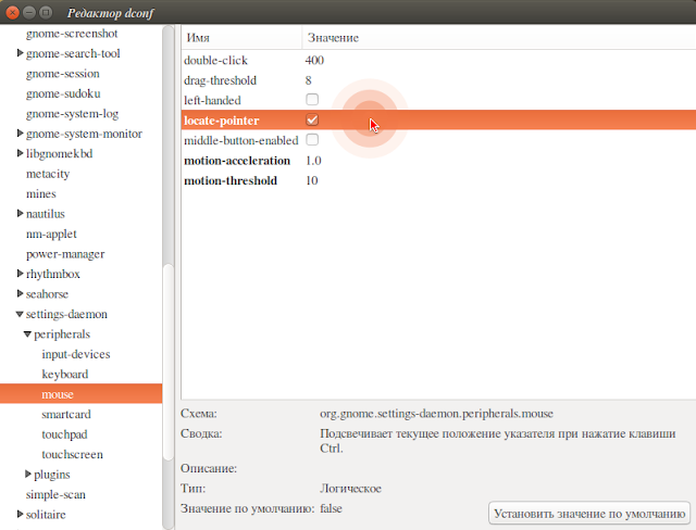 Теперь откройте Редактор dconf, перейдите по следующему адресу: org — gnome — settings-daemon — peripherals — mouse и активируйте функцию locate-pointer (найти указатель).