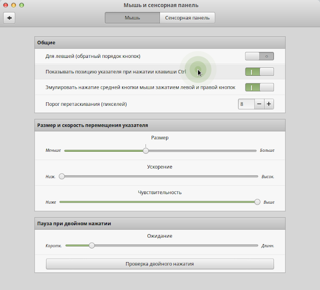 В дистрибутивах с рабочим столом Cinnamon: Linux Mint Cinnamon, openSUSE Cinnamon, Manjaro Cinnamon и пр., функция поиска курсора мыши находится: Параметры системы — Мышь и сенсорная панель — Мышь, активируйте пункт Показать позицию указателя при нажатии клавиши Ctrl.