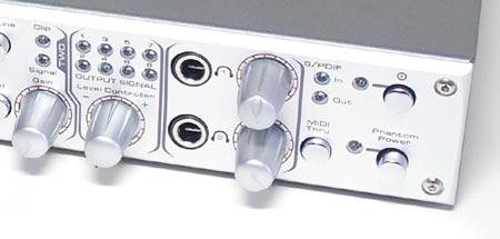 Ещё правее — два 6.3 мм гнезда для подключения наушников. Каждое из них имеет свой регулятор громкости. Справа от верхнего установлены пара светодиодных индикаторов S/PDIF входа и выхода, выключатель питания, кнопка включения MIDI-Thru (обход аудиоинтерфейса для MIDI-устройств) и кнопка Phantom Power.