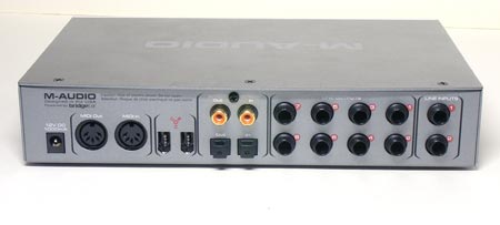 Сзади на корпусе установлены гнездо питания, два 5-контактных MIDI-порта, два порта FireWire, благодаря которым к аудиоинтерфейсу можно подключить ещё одно устройство FireWire, коаксиальные и оптические S/PDIF входы и выходы. В правой части установлены восемь 6.3 мм гнёзд аналоговых выходов и два 6.3 мм аналоговых входа. Обратите внимание: в отличие от Audiophile FireWire, этот интерфейс не имеет аналоговых RCA выходов, так как относится к более высокому классу устройств, где другие кабели и другие разъёмы. Здесь так же все разъёмы подписаны сзади и сверху на корпусе для удобства подключения.