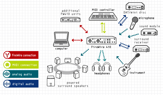 Мобильный интерфейс FireWire 410 уже своим названием говорит об основных особенностях: четыре входа и десять выходов. Это более функциональное устройство, нежели Audiophile, поэтому даже разъёмы здесь уже другие, рассчитанные на другое оборудование. Вот схема подключения FireWire 410 к мультимедиа-устройствам: