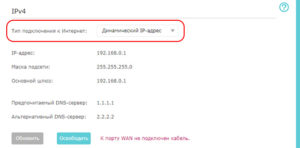 Поставщик услуг использует метод подключения через динамический адрес, полученный роутером C60 от провайдера. Заходим через параметры сети, выбираем тип подключения «Динамический IP»: