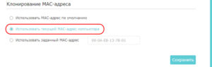 Переходим к подразделу клонирования физического адреса, выбираем второй пункт. Если пользователь желает указать другой MAC-адрес, активируем третий пункт. Вручную указываем его, нажимаем «Сохранить»:
