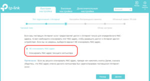 Третий шаг предлагает клонировать физический адрес сетевого адаптера. Данная опция необходима только в том случае, если провайдер предоставляет доступ в интернет только «белому» списку MAC-адресов. Если в этом нет необходимости – оставляем параметр в текущем состоянии: