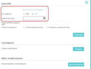 Первым делом необходимо активировать VPN, так как изначально он выключен на модели C60. Выбираем протокол передачи данных при использовании OpenVPN: TCP или UDP. Указываем значение порта, по умолчанию оно равняется 1194.