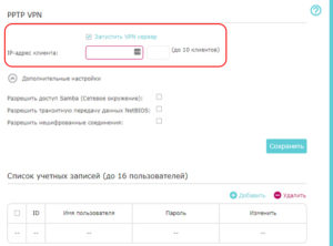 Роутер Archer AC1350 имеет функцию встроенного VPN-сервера на двух разных протоколах. Настроить его можно в одноименной вкладке на правой панели: