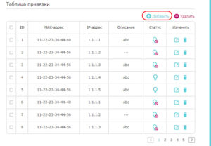 Пользователь нажимает «Добавить». Открывается рабочее окно, куда вносится информация. Клиент указывает физический и IP-адреса, далее придумывает описание привязки. Сохраняет изменения. Теперь при каждом активном соединении физический адрес устройства будет проверяться по ARP-таблице. Если там присутствует данное значение, ему будет присвоен соответствующий «айпи»-адрес.