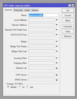 следующим этапом создаём PPP профиль, соответственно заходим в раздел PPP вкладка Profiles добавляем профиль кнопкой +, вводим имя, локальный адрес микротика с которым будут работы нашим клиенты, должен лежать в подсети с созданным ранее пулом адресов и указываем пул, остальное оставляем без изменений