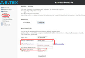 Для защиты сети от постороннего вмешательства выбираем во вкладке «Безопасность» (Security) параметры проверки аутентификации сети с выбранным именем — Mixed WPA2/WPA-PSK, а также тип шифрования информации: AES. В заключение прописываем индивидуально созданный пароль, состоящий из последовательности латинских букв и цифр числом не менее 8 и не более 15. Завершается настройка выполнением команды «Применить» (Apply).