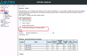На странице общих настроек открываем вкладку Wi-Fi, в ней кликаем по пункту Basic. В его развернутом окне отмечаем галочками клетки включения беспроводного соединения и включения беспроводного мультикаста (WMF) для потокового IPTV. Затем придумываем имя сети и заносим его в поле SSID. В заключение выполняем команду «Применить» (Apply).