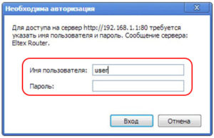 В строку адреса вводится IP-address ONT, в зависимости от прошивки имеющий значение 192.168.1.1 или 192.168.0.1. Нажимается Enter на клавиатуре ПК. В окне авторизации записываются логин и пароль устройства по умолчанию: user/user, нажимается трафарет «Отправить».