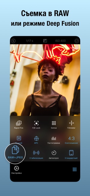 Приложение позволяет настроить экспозицию и фокус. Среди профессиональных инструментов Halide можно найти подробную гистограмму, адаптивную сетку и точную фокусировку. Для всех iPhone, начиная с модели 6S, присутствует поддержка RAW.