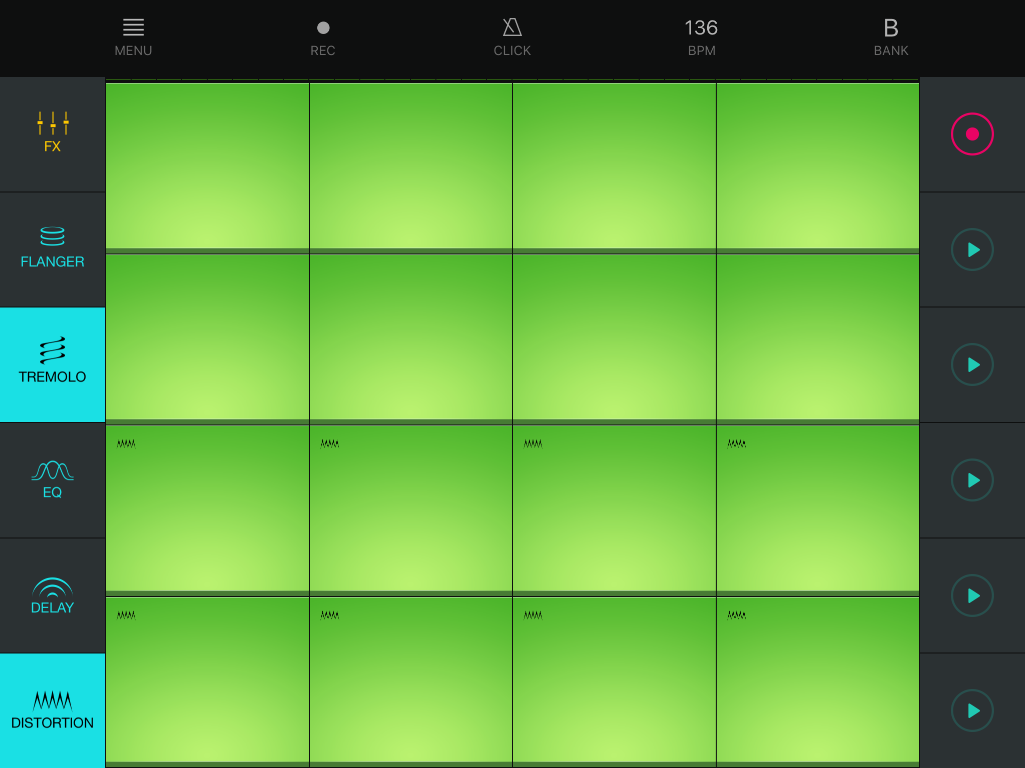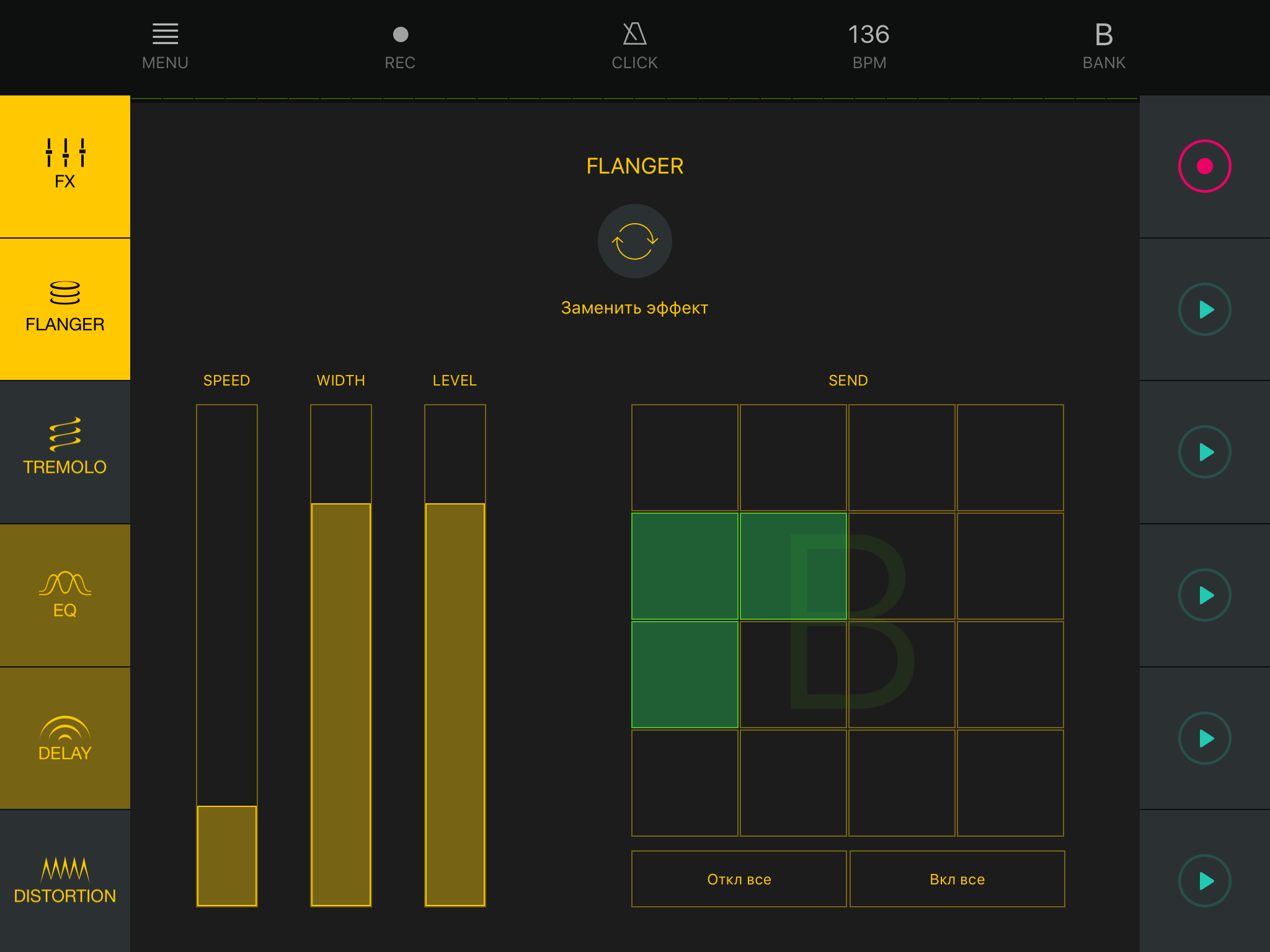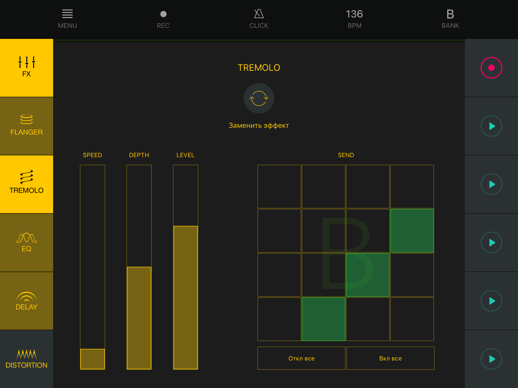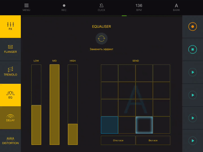 Нельзя не отметить то, как разработчики Beat Maker Go! подошли к созданию меню управления эффектами. Чтобы не перегружать интерфейс, они дали возможность пользователям для начала активировать режим редактирования, а затем переключаться между настройками эффектов для их изменения. При этом интерфейс отлично отображает состояние эффектов в данный момент и позволяет быстро активировать или деактивировать любой из эффектов. Замена любого эффекта на другой, выполняется в том же режиме и за считанные секунды.