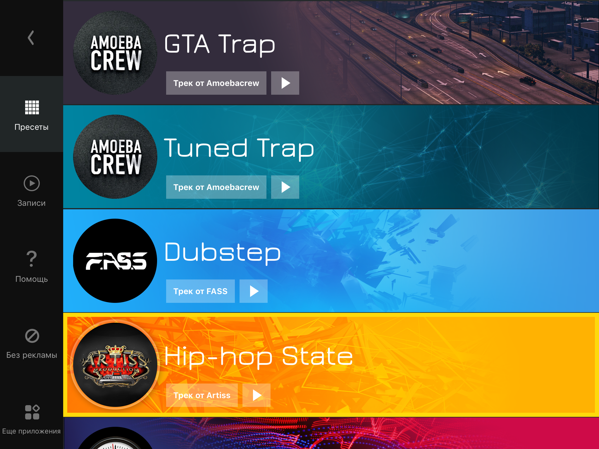 На момент выхода, в Beat Maker Go! доступно семь пресетов (так называются наборы установок для каждой аудио композиции) в различных жанрах от Hip-hop до Drum-n-Bass, приложение абсолютно бесплатно и не требует дополнительных покупок.