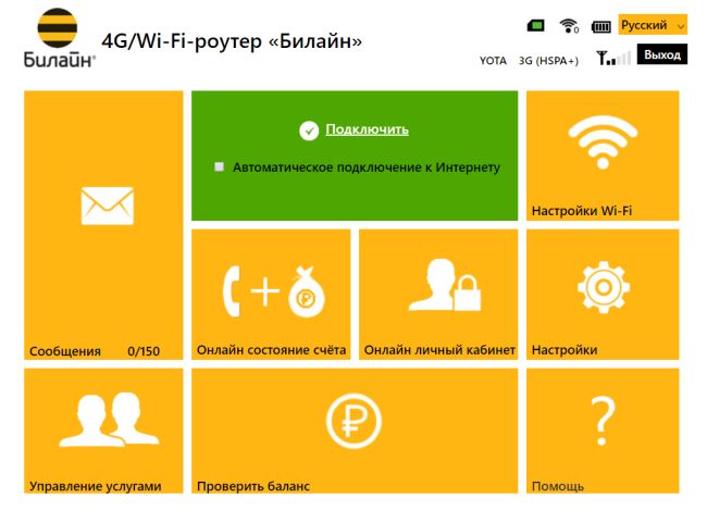 Графический интерфейс устройства выполнен в уже привычном нам по другим продуктам Билайн «плиточном стиле»: