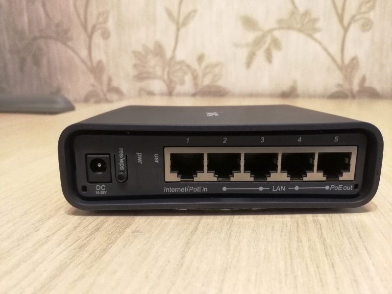 С «обратной» стороны у нас расположился разъем питания 10-28В, совмещенная кнопка reset/wps, LED индикаторы подключенного питания (pwr) и активности (usr) и конечно же пять Ethernet портов: