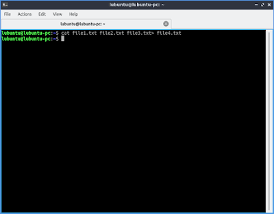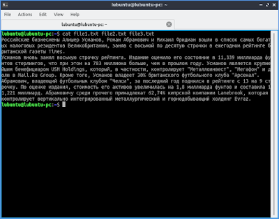 Теперь если вы откроете файл file4.txt с помощью команды cat или с помощью выбранного вами текстового редактора вы обнаружите что он содержит текст первых трех текстовых файлов.