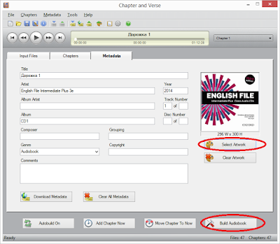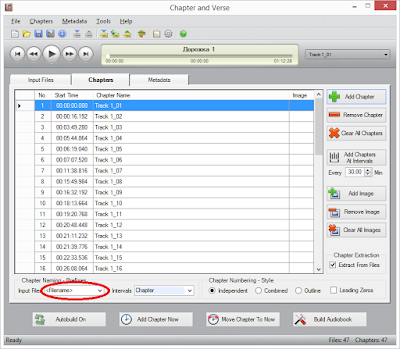 После добавления файлов (или экспорта с AudioCD) можно задать имена/названия главам, подглавам и присвоить отдельную иллюстрацию каждой главе (при необходимости).