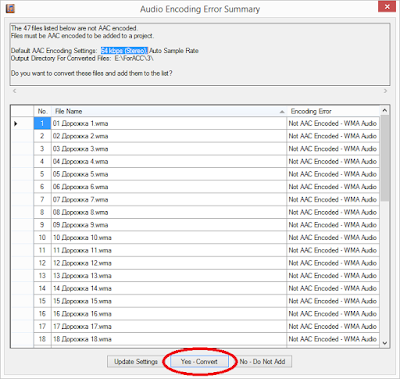1) На вкладке Input Files кнопкой Add Files выбираете нужные файлы. Затем, если это не ACC вам предложат их переконвертировать, нажимайте Yes — Convert.