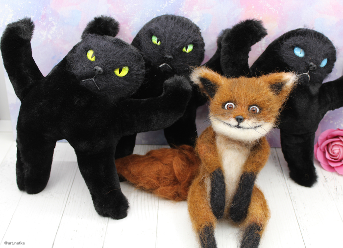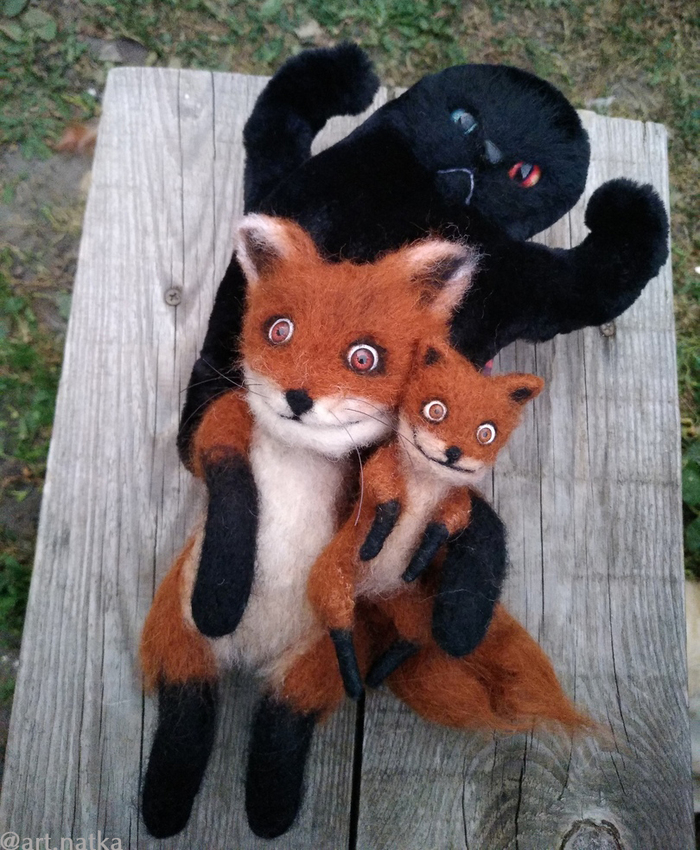 Сваляла из шерсти, внутри проволочный каркас. Котик 6 см в высоту, лис 10 см примерно