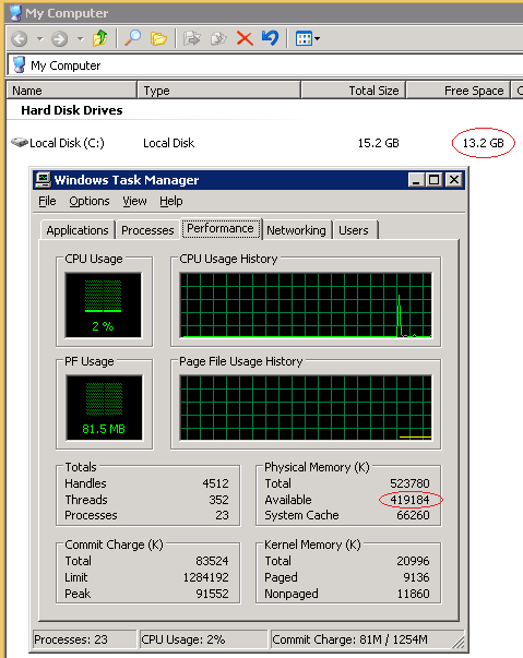 400 мб свободной памяти и 13 Гб диска. С этим уже вполне можно жить.