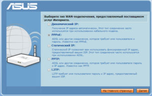 Данный вариант предполагает использование встроенной утилиты QIS маршрутизатора Асус WL-520GC. Запускаем Quick Setup, следуем подсказкам «Мастера». Он предложит выбрать тип подключения, который используется провайдером.