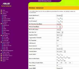 У модели Asus WL-520GC есть одна особенность. При включенном мультикасте перестает работать беспроводная связь. Чтобы исправить данную проблему, заходим в раздел расширенных настроек Wi-Fi. Находим пункт Multicast Rate и устанавливаем значение «1». Сохраняем внесенные изменения, перезагружаем роутер.