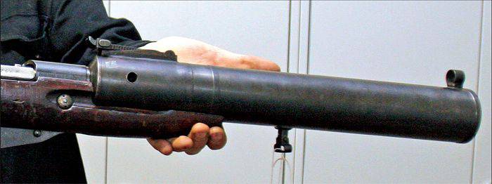 Фото: 44,15-мм самозарядный гранатомёт конструкции Кулакова. Для облегчения горизонтирования довольно массивной системы винтовочная ложа получила пистолетную рукоятку, а для снижения воздействия отдачи – амортизатор вместо затыльника