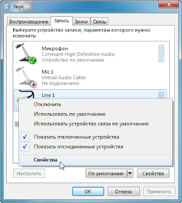 Переходим во вкладку «Запись», щёлкаем правой кнопкой по устройству «Line 1» и выбираем «Свойства»: