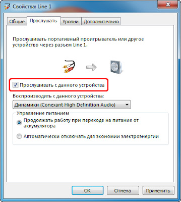 Во вкладке «Прослушать» ставим галочку «Прослушивать с данного устройства», а «Воспроизводить с данного устройства» выбираем динамики: