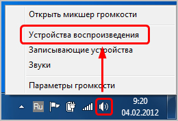 Щёлкаем правой кнопкой на значке аудиопараметров и выбираем «Устройства воспроизведения»: