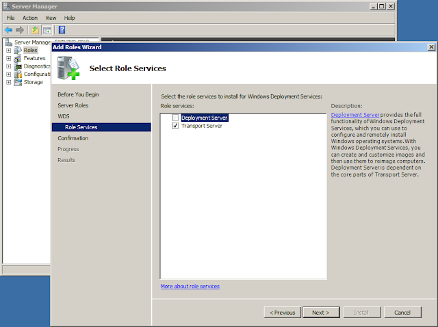 Для установки TFTP требуется запустить Server Manager и добавить новую роль Windows Deployment Services. На этапе выбора компонентов нужно выбрать Transport Server.